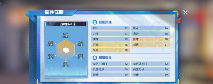在整体的属性六维图当中他最弱的一项是进攻,只有15点的评分,而在预判的数值上面则是有28,所以这是他最强的属性以及最弱的属性,强的属性大家要利用起来,而比较弱的地方大家在球场上最好是避开,所以石崎了在定位上面一定要非常清晰才可以带来优势,而在招式动作上面他依靠颜面挡球这个技能可以用来作为封堵的效果用,在其中使用技能石崎了就可以进行一次威力为143%封堵属性的封堵,且本次的封堵动作可以降低对手身上7.6%控制值,用来抢夺球权是非常管用的。