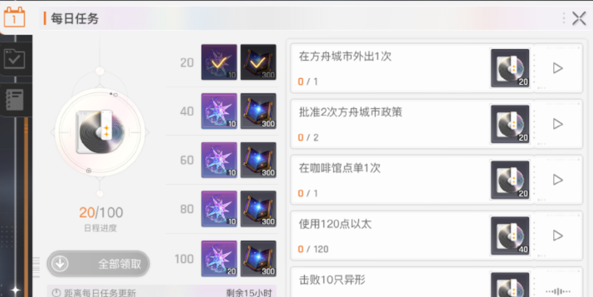 就副本而言,建议玩家优先刷取角色升阶素材以及每周限定三次的挑战。尤其是50级之前的新手玩家,应该优先刷取金币副本,因为后期升阶的时候金币会非常短缺。对于记忆碎片的刷取,建议等到50级之后再进行,此时角色能力提升之后刷取效率会更高。常驻战斗任务也可以作为经验的一个来源。每个任务完成之后都可以获得200点的经验,这些任务一般都会在方舟都市的政策室里被触发。虽然收益一般,但是随着任务的进行,完成这些关卡仍然是增加经验获取的有效途径。