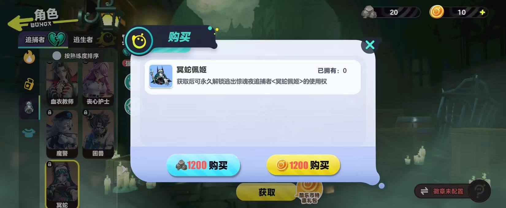冥蛇佩姬就有两种解锁方法,有永久解锁,还有限时体验。玩家可以通过酷乐币去获取,只需要打开游戏的主界面进入到商店切换到娱乐玩法,就能找到逃出惊魂夜的主题,在这里就可以直接兑换。或者是在逃出惊魂夜的玩法图标进入到准备页,点击一下左侧的角色入口,在追捕者的列表中也可以选中,然后去点击兑换。酷乐币的获取并不是很难,通过日常任务或者是正常的对战就可以获取,并不需要选择额外的氪金。