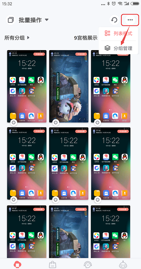1、进入专业版安卓端云手机列表界面,点击右上方省略按钮,选择“分组管理”,可根据项目任务对所有云手机进行分组。