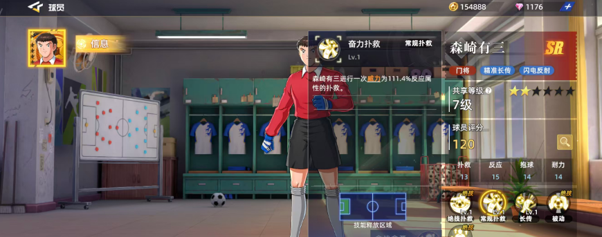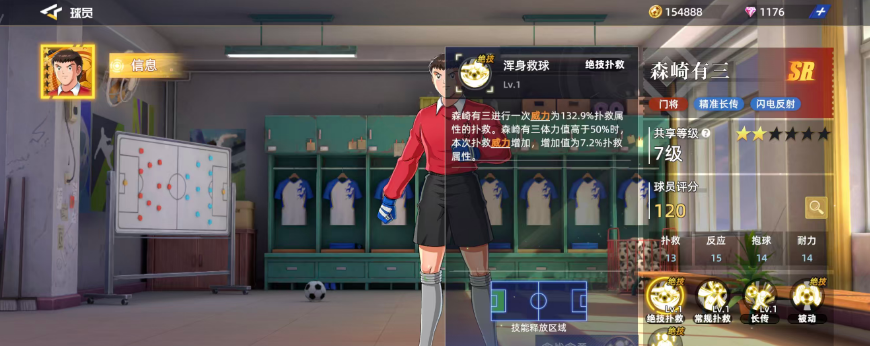 作为专一守门员定位的角色,森崎有三的所有能力都围绕防守展开。其总评分为120,在SR级别中不算突出,但由于高阶门将获取难度较大,因此他在前期出场率相对较高,是不少玩家组建初始阵容时的可靠人选。
