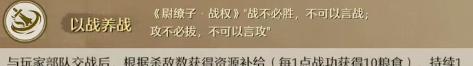 严刑明赏所带来的效果就是让队伍中三个武将的体力恢复到60点。前期开荒、打怪以及野外练级的时候非常重要,能够给玩家争取到先机,拉大与敌人的距离。技能释放后马上生效,虽然有24小时的冷却时间,但是对于前期的资源争夺很有帮助。而以战养战的目的就是用战斗来获得资源的补充。敌军交战之后,根据玩家的战功来决定是否给与相应的粮草奖励。每取得一次战斗功勋就可以兑换十石粮食,开启后可以持续一个小时,八个小时之后就会冷却。战功高的高战玩家获得的资源补给也越多,保证了快速扩张以及兵力补充的持续进行。