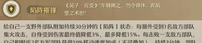 陷阵催锋可以使玩家的部队进入“陷阵”状态,提高其抗打击的能力。当自己部队被集火的时候,伤害降低3%,最多降低到15%。另外,每消灭一个敌方部队,自身和周围的两个友军单位的速度都会提高。该技能在混战中非常重要,可以用来反杀敌人,适合高战玩家使用。火刃燎原可以增加战斗中的溅射率。使高战玩家在大范围战斗中可以释放出更大的AOE伤害,对敌人全部部队造成毁灭性的打击。除了可以增加玩家在战斗中输出之外,还可以给玩家带来更加激烈的热血战斗体验。