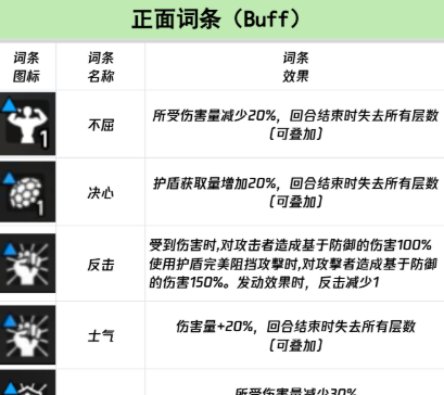 先从正面词条介绍,不屈:在触发该词条后,获得的词条效果为所受伤害减少20%,且该技能在战斗过程中可进行叠加,不过在玩家回合结束后会失去所有的叠加层数。(叠加效果小注:以不屈为例,拥有两层可减伤40%,三层减伤60%,以此类推,其他技能叠加也均有此效果。)