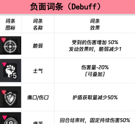 再来分享一下负面词条。脆弱:受到了伤害,直接增加50%,在发动该效果时脆弱减-1。