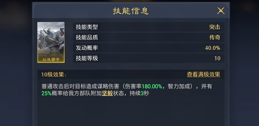 那么这里郭嘉他的这个以攻固守技能,也是非常适配于这个阵容效果的,在其中的话郭嘉打出普通攻击之后,还可以对目标带来一些谋略类型的伤害,这类伤害效果在伤害概率上面,虽然只有180%的加成,但是他能够带来的也有智力类型上面的属性提升效果,并且自身还有25%的概率,可以给我方部队施加一个减益的效果,减益效果一旦生效的话,在上面会直接持续3秒时间之内,为大家带来增益效果。
