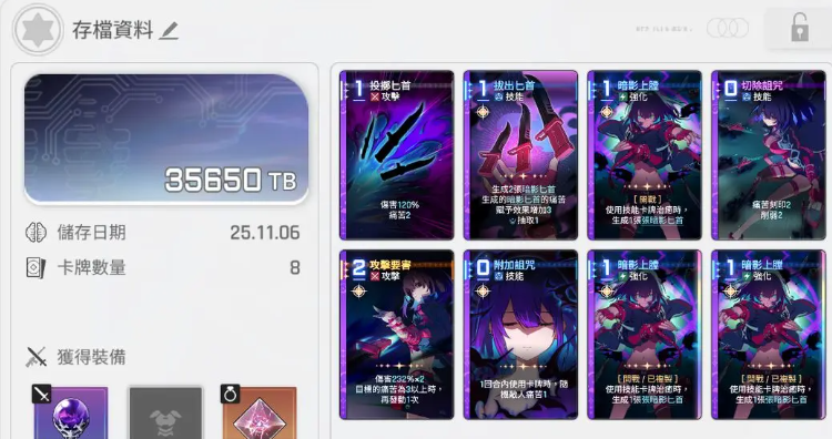 那么扔飞刀的时候一定要注意整体的稳定性,因为每一次带出来的档都是根据存档的效果不太一样,所以在这里大家打存档的时候一定要注意,德蕾莎的话基本在上面都要删除卡,其他的卡都无所谓,一般来说她是不会被卡手的,这里最主要的就是暗影上膛这张卡,所以如果要进行复制的话,一般出3张复制就可以了,达到够用的效果基本就不用再进行复制了,因为开局的话,就达到了3费,所以更多的情况下也扔不出去。