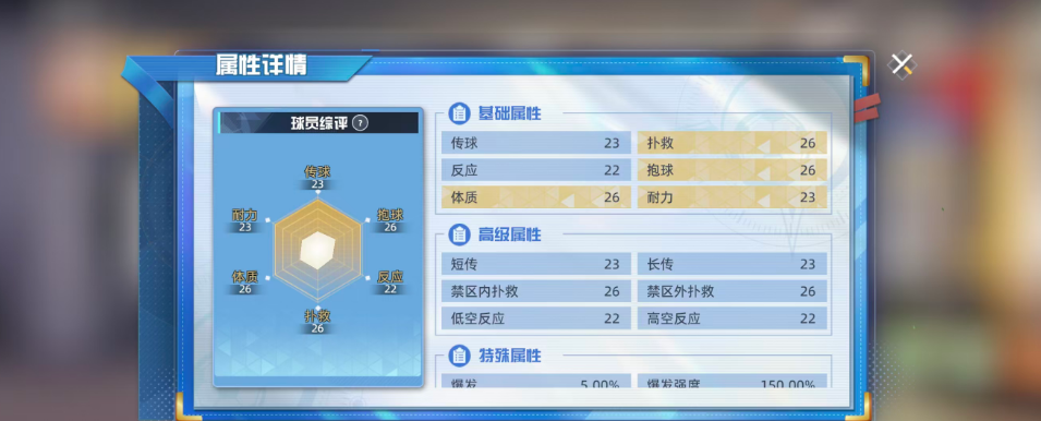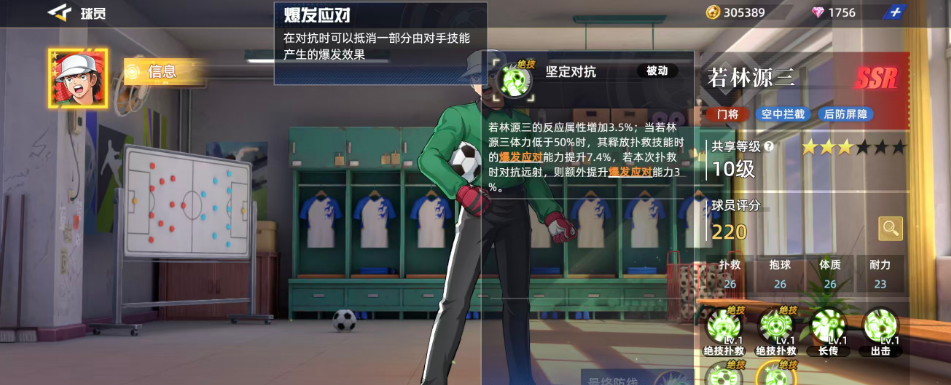 坚定对抗:这同样是若林源三的被动触发效果,在上面主要是根据反应属性的效果增加3.5%;当若林源三体力低于50%时,其释放扑救技能时的爆发应对能力提升7.4%,若本次扑救时对抗远射,则额外提升爆发应对能力3%,其中的爆发应对是指的在对抗时可以抵消一部分由对手技能产生的爆发效果。