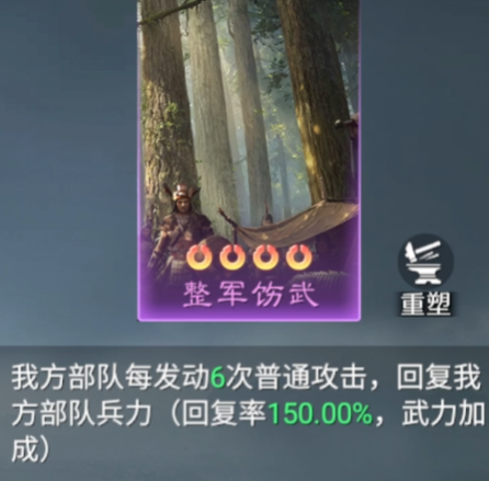 第二个是为大家推荐一个整军伤武技能卡,这个技能卡当前效果当中可以为我方的部队带来没发动6次普攻后可以触发的一个效果,只要达到这样的次数之后,大家在上面就可以为我方的武将带来部分兵力的恢复,而且在上面还可以带来兵力数值上面有150%的回复率,所以在武力加成效果上面还是非常明显的。