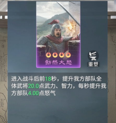 这里比较推荐的有勃然大怒:这个技能卡在大家进入战斗的前18秒时间里面,会给我方的部队成员全部都带来20点的物理数值加成,以及相同数值的智力数值加成,且同时在大家需要怒气数值的时候,这个技能卡还可以给大家带来部队4点木器数值的积累,所以有这个技能卡前期大家使用怒气大招的顺序都会提前很多。