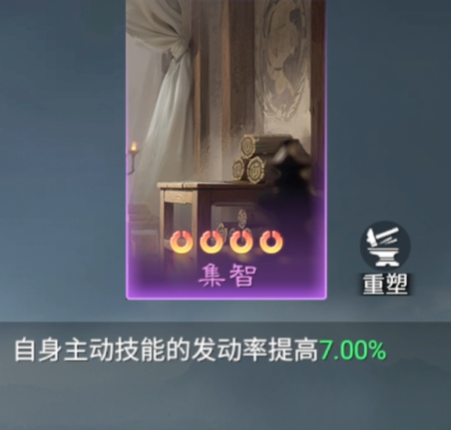 接下来为大家推荐的是集智这个技能卡,在游戏当中,通过这个技能卡可以给武将发动自己主动技能的时候带来更多的成功概率,只要能够发动技能,其中一些额外效果的触发百分比都会在发动概率上面有7%的数值提升,可能部分玩家会以为这样的百分比数值不高,但是这是基于本身主动技能百分比已经很高的情况下用,所以针对一些本身自己主动技能就比较好用的玩家来说,这样的效果就是比较有加强意义的。
