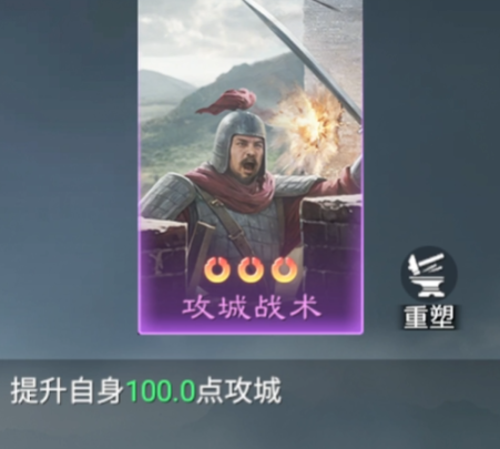 攻城战术这张技能卡其实具有一些特殊用法,一般情况下大家如果是打架的话可能用不上,但是如果是去攻城的话,那么其他的卡反而没有这张卡那么好用,在上面这张卡可以为装备这个技能卡的武将带来100点的攻城数值加成,让大家攻城的时间更快优势会更大,但是这类技能卡其实很多玩家前期是拿不到的,因为此时大家更关注的是一些战斗类型的加成效果,所以针对攻城卡后期的用处会更大一些,但是那个时候再获取的话难度也比较大,所以如果拿到攻城卡的话,其实大家就可以放起来,后期需要的时候再用。