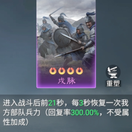 戌脉这个技能卡本身品质还可以的同时其实很多玩家都是用过的,因为可以给大家带来一定的兵力恢复效果,但是这里是只有在进入战斗时间㘝21秒结束之后这个技能就很难再给大家带来恢复了,这里触发技能之后每3秒的时间之内都会为我方的武将带来部队兵力数值达到300%的回复效果,且此时子啊兵力恢复效果上面不回受到属性效果的加成,所以回复效果不错,但是没有额外的加成效果叠加。