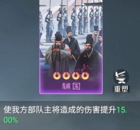 辅国这个技能卡其实放在前期很多玩家还不太会用,因为带来的加成效果比较简单,但是其实只要大家在上面能够找到适配的武将,这个技能的战力加成是非常厉害的,在其中大家可以根据技能卡的效果来给我方主将的效果增加15%左右的伤害提升能力,所以这个技能卡其实在搭配一些输出类型主将的时候效果最好,如果是智谋类型的武将这里可能提升的效果反而没有那么好,那么针对这里带来的百分比提升自然会让强势的队伍更加强势。