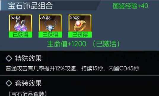 该套装基础属性属于55级金色饰品中的第二档,套装属性增加10%攻击力,特殊效果提高攻速,能够丝滑提升输出效率和总伤数值,对于输出职业来说是一套性价比较高的强力装备。