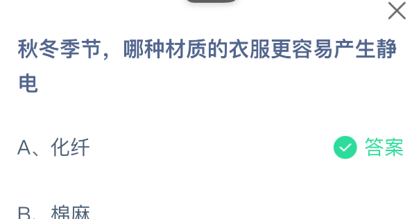 以上就是秋冬季节,哪种材质的衣服更容易产生静电,支付宝蚂蚁庄园2025年12月3日答案最新,更多精彩内容,请点击关注更新!