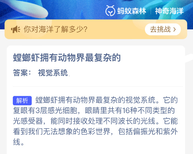 螳螂虾拥有动物界最复杂的?【神奇海洋】12月2日新题目已开答!正确答案现已公布,点击领取拼图,一起为修复海洋生态贡献力量!今日正确答案是:【视觉系统】。螳螂虾拥有动物界最复杂的视觉系统。