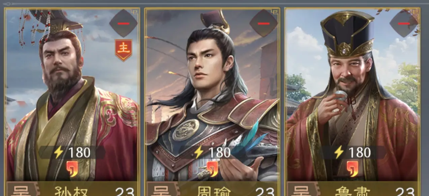 所以在持续输出上面,这个吴国恢复弓队,大家也可以带来足够的输出数值,其余位置上面放的周瑜,他本身是有一些灼烧技能效果可以持续带来伤害的,所以有这类效果的同时,也有一定的技能加速释放的加成效果,那么放在这里的话,跟孙权搭配在一起就可以让我方在伤害技能上面,兼顾了一个持续伤害的同时,带来爆发的次数也更多,而鲁肃在技能效果上面基本都是通过兵种搭配带来足够的加成,这里他后期还可以通过技能卡来搭配一个有恢复能力的技能。