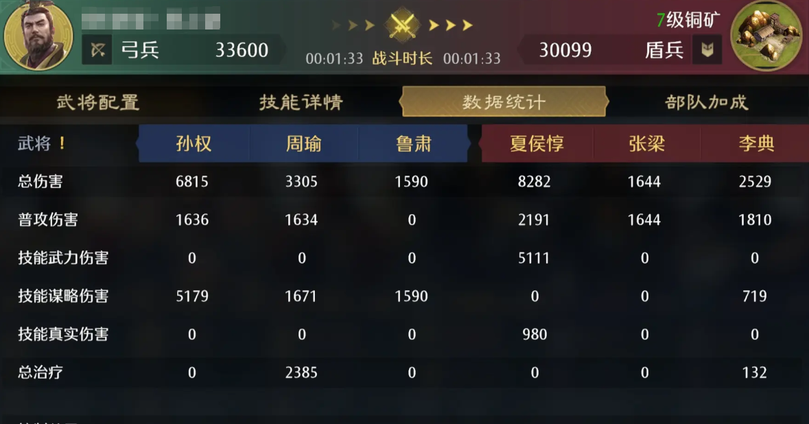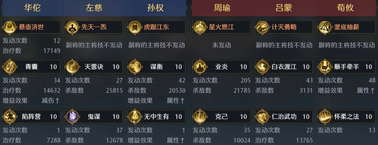 这样其实根据吴国里面大部分武将都有的一个智力以及谋略加点效果,后期给武将进行其他兵法搭配的时候也主要考虑这方面能力,足够的加成通过战报大家可以看到整体的百分比达到的数值也是非常高的,当然很多玩家觉得孙权在这里如果带群体技能的话有点浪费,所以用周瑜当主将更好一点,那么这里其实他们俩的能力上面是可以进行调换的,因为孙权如果没有带对卡的话,那么可能伤害数值上面就没有那么高的能力,利用他在这里的能力,大家将周瑜换成主将的时候,可以多带一些输出类型的技能卡,那么在孙权的效果上面再将他变成辅助的技能卡也是可以进行替换的。