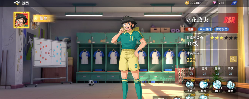 立花政夫在游戏当中也是一个前锋,可以跟边锋的位置进行替换使用的球员,目前在游戏当中他一般情况下其实是跟立花政和夫一起上阵的,因为他们两个人就是其中双人射门当中的主要成员,他在防守反击上面也是可以带来不亚于立花和夫的效果,但是在总体的评分效果上面是比立花和夫多那么2分的,他在整体效果上面可以利用到的技能效果当中,大家可以注意到他在目前使用技能的时候,基础带来的长传效果会比立花和夫更好用一些,那么这里是用他长传的话如果没有收到场抢球属性的影响,他增加的15%长传属性也可以为他带来更多的传球效果,后期使用各种突袭技能进行抢点的时候,这里带来的生效效果当中有一个高空飓风的能力,所以此时进行抢点的话他也会有一些空中优势的动作可以使用。