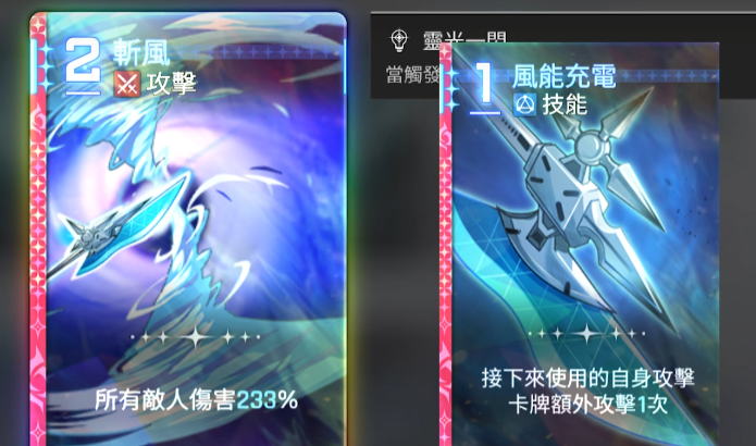 而在他的卡牌效果上面其实除开防御的效果之外,普攻伤伤都是可以用到的,风能充电这张卡属于一费技能,接下来是的自身攻击卡牌,可以带来额外攻击一次,风能充电层数能够在欧文的角色血条下显示,同时支持跨回合累计额外攻击一次,是多加了一个伤害判定,因此不会触发其卡面的额外效果,对单段高效输出卡有较高增益,对多段输出的提升其实相对于大家想要的强度来说可能是不太尽如人意的,但是这里有灵光的话,就可以带来重要的衍生效果,这就使得欧文有了比较独一无二的辅助能力。