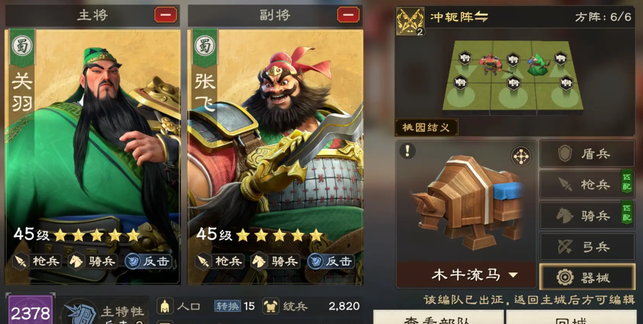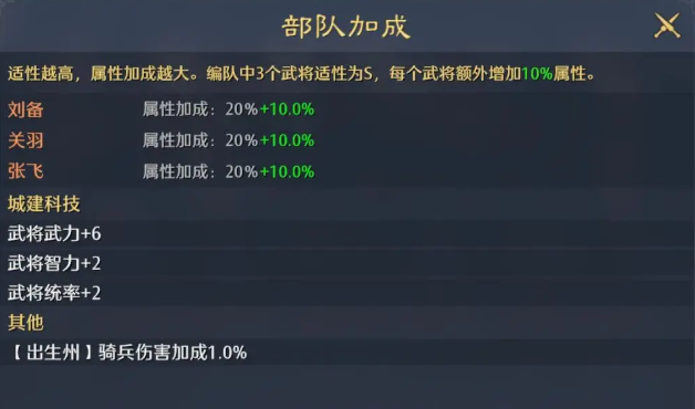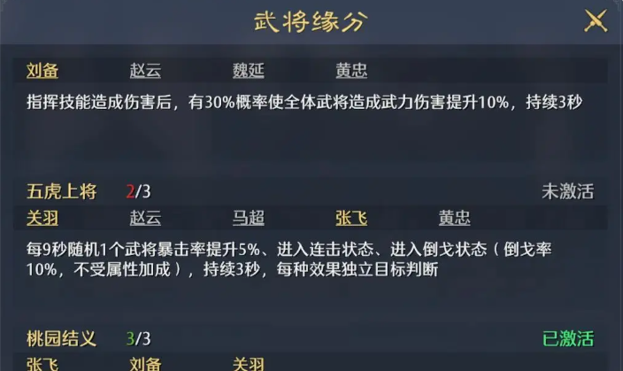 其次在关羽的技能状态当中他的武圣状态是比较独特的,因为这里搭配的是枪兵嘛,所以根据关羽的武神状态带来上面的发动率,有10%提升之后可以在整体兵法中带来更高的价值,在有足够发动力的情况,下面整体阵容的输出就非常稳定,而且后期还有一定的控制效果,加上刘备还能兼顾到这里一个治疗的责任,所以对于前期的搭配来说这里骑兵搭配是能够对重伤类型的目标伤害提升15%的,所以这两者搭配在一起的时候,他们会带来50%的概率,可以给目标附加一些重伤能力,枪兵主动技能吃饭的概率也可以提升10%,所以整体阵容核心思路上面只要多触发,其中的重伤能力以及覆盖更多的虚弱,那么大家一边打的同时触发的更多的武将缘分,一边就可以拉开整体阵容的一个血量差距啦。