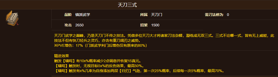 武道单挑:天刀三式爆发潜力高,但飘雪刀诀的免伤加成和残血威慑力使其容错率更优。