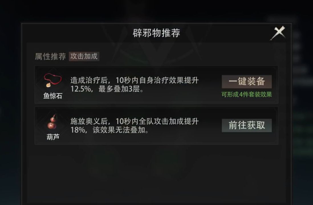 不同的辟邪物效果也不同,当人们搭配单间时只能令角色享受到辟邪物本身所带来的属性加成,搭配两件以上时,辟邪物会生效对应的两件套效果,四件时则会生效四件套效果。不同辟邪物在混搭时,只要所装备的数量满足两件或四件,都能生效对应的效果,再加上每位角色最多能搭配六件辟邪物,所以各位可使用“4+2”或“2+2+2”的搭配方案,尽量确保角色能吃到套装属性加成,除非自己手上没有成套的辟邪物,否则最好别用散件来混搭。