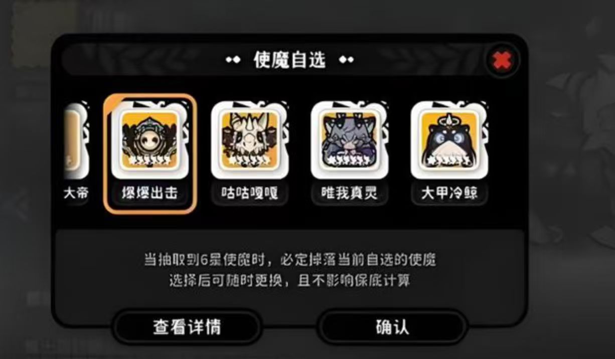 形影不离卡池最受玩家好评的特色就是保底加自选的两种机制。玩家抽到一定次数必定会抽中六星使魔,并且可以在自选包里挑选自己喜欢的角色,这大大减轻了玩家运气不好时的挫败感。相比其它同类型的游戏单纯的随机保底,火环给了玩家在重要突破的时候选择目标的机会,使得资源、时间的付出更加有价值。对于想要快速锁死核心主C或者想要补位功能位的玩家来说,这个机制就非常友好,阵容构建完全摆脱了玄学。