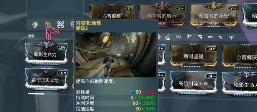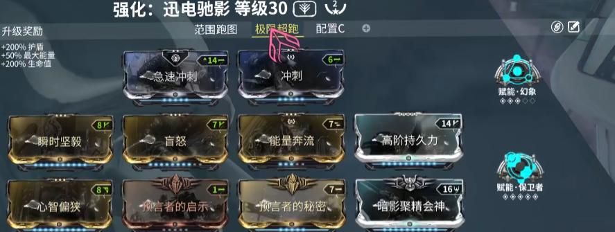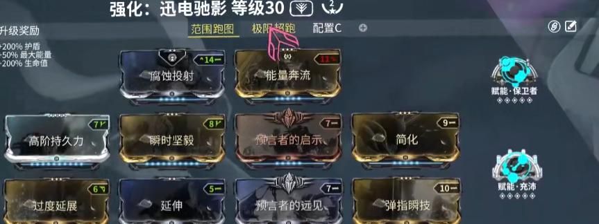 【泛用型超跑配卡】适用于日常刷图、资源采集及中长距离快速转场。核心思路是平衡能量续航、技能持续时间与范围覆盖能力。推荐MOD组合为:腐蚀投射、能量奔流、高阶持久力、瞬时坚毅、预言者的启示、简化、过度延展、延伸、预言者的远见、弹指瞬技;赋能选择保卫者与充沛。该配置下,马赫冲驰(1技能)触发频率高,配合赤限(4技能)开启后显著降低技能能耗,整体节奏流畅稳定。