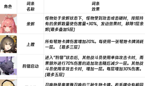 护盾类型的负面词条主要针对游戏中的防御体系进行搭建,直接影响了角色通过护盾获得的生存保障,其中伤口词条的作用是降低角色获取护盾的总量,效果一旦施加就会在回合内持续存在,没有主动消耗层数的限制,只能通过特定的词条技能或者道具进行净化,对依赖护盾进行防护的坦克角色或者辅助角色来说,伤口的效果是非常明显的,原本能提供充足的生存空间,但是在伤口的作用下也会大幅减弱,可能会导致前排角色快速的被击破,威胁后排的输出。