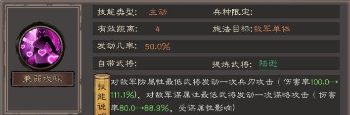 效果:对敌军防最低目标发动兵刃攻击、谋最低目标发动谋略攻击,能精准打击敌方短板单位,适合作为陆逊的补伤/针对技能。