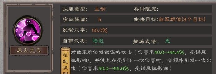 类型:主动技能,定位是“群体谋略输出+联动火攻”,梯度为T0级谋略输出技能。