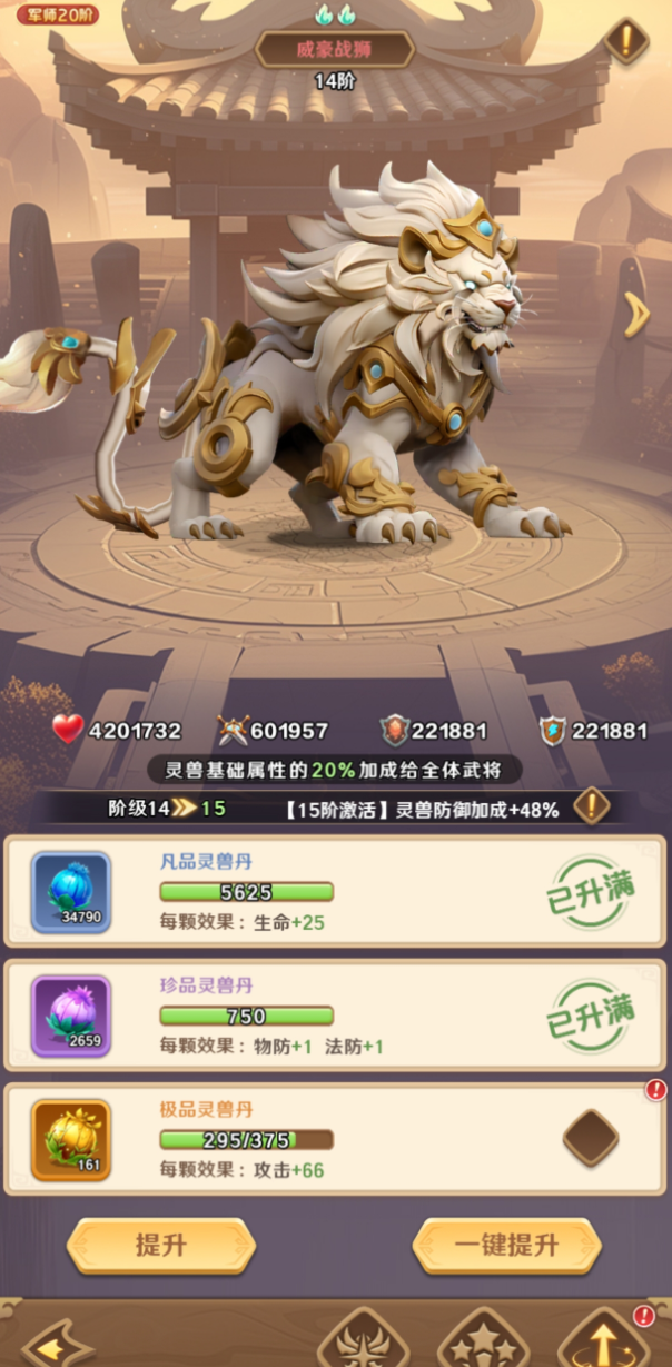 豪威战狮:在游戏前期的时候,玩家倒是可以选择这只灵兽,因为它作为全能型的输出类型的灵兽。在战斗的时候,它可以直击战斗核心的痛点,一旦施展技能之后,就可以给整个武将提供怒气值的加成。额外也可以让伤害,暴击率以及爆伤等等方面的提升。其实对于他的出现,往往能够让整个队伍的实力增强。不过对于玩家来说,在资源分配方面的话,可以直接将豪威战狮提升到6星,然后就能够解锁被动技能,再合理的运用它。