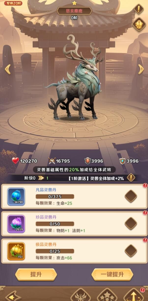 玄慈麋鹿:在游戏前期的时候,它能够构建成最强的防御体系。另外,玩家如果资源有限的情况下,倒是可以长时间的培养,毕竟他的实力也是比较强悍的。其实对于玩家来说,他每回合开始的时候就能够给自己的队友吸收能量,从而让自己提高15%的护盾。另外他还能够让自己队伍有30%的概率触发复活的情况。不过玩家这时候也需要注意,要合理的搭配,并且也是要根据自身的资源以及情况,选择合适的灵兽进行培养。