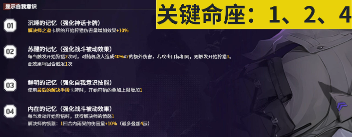 0命的小春和2命的小春用起来手感是完全不一样的,再包括相对比较冷门的路克其实也是同样的道理,那么对于这种提升能力非常大的命座,就是其中的关键命座,那么这类命座的提升,大概也是分为四类,首先就是强化自身的神化卡牌,第二类也是最多的,就是强化战斗被动卡牌的效果,这一方面其实就包括了其中机制的拆分,第三类则是强化自我意识技能,也就是需要消耗能量的大招,那么第4类则是不太关键的强化能力值,目前每个角色的五命都是强化能力值,所以说大家要重点根据强化战斗的被动效果来进行判定。