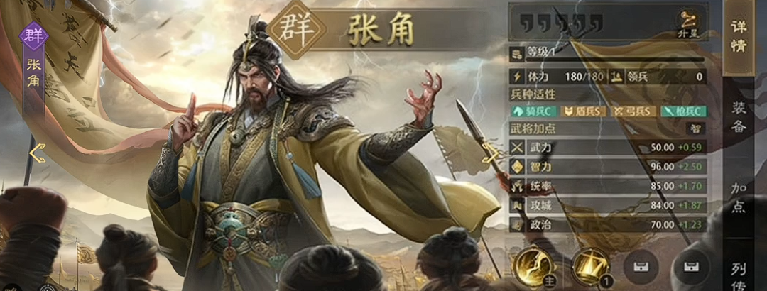 而另外大家还可以选择的是张角这类角色,张角放在群雄阵营当中的话其实可以带来的谋略加成效果更明显,在上面也可以搭配同类武将一起来组成谋略阵容,而且在技能效果上面其实走谋略路线的主将是不多的,而这里的张角正好是其中之一,他在自身技能效果上面有群伤之外,还有一个二段的输出机制是可以依靠一次输出来触发的,而且大家比较熟悉的三仙盾或者是有法师的阵容当中一般都是会用张角的,后期在技能卡牌上面也很好搭配,有谋略伤害类型的提升就可以带来足够的辅助联动,比如说左慈就是非常好的联动武将,也是经常跟张角一起出现在三仙盾当中的一个成员。