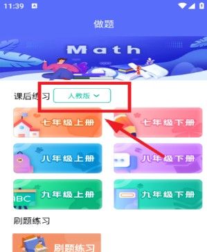 初中数学助手app怎么更改教程,用户在本站下载安装好软件,点击手机桌面图标,打开app,进入首页看到默认的是人教版,点击一下,点击你要的版本就行了。