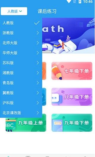 初中数学助手app有哪些功能,首先用户需要在本网站下载安装好这款软件,在线选择自己学习的教材版本,人教版,浙教版,北师大版等等,选择好之后可以看到其中的内容与书上的信息是对应的,可以自由选择练习的章节。