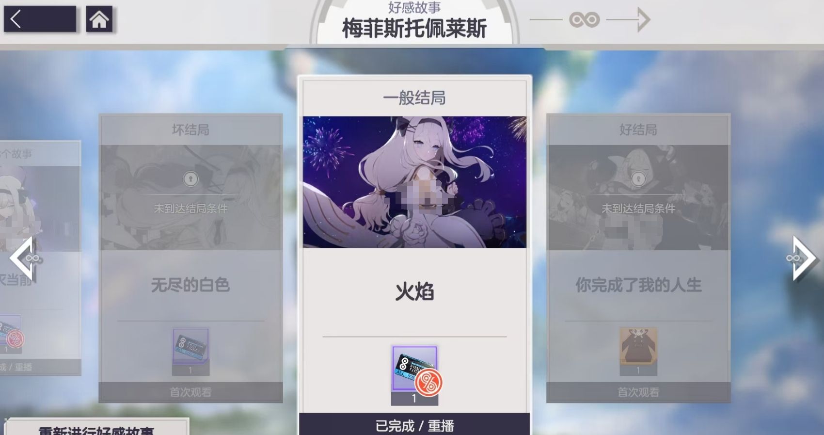 当玩家们成功在好感故事里打出好结局后,还能免费拿到精灵服饰作为奖励,完成哪位精灵的好感故事就会给谁的免费服饰,因此各位若发现某位精灵的服饰很好看,可集中资源优先培养她的好感等级把服饰给拿到手。部分精灵除了能通过好结局拿到免费服饰外,若打出坏结局同样也会给玩家一套免费服饰,但不能与好结局的服饰同时拿到,只能做两次好感故事打出两种不同解决后分别获得。重新进行好感故事需消耗100永恒石,所有剧情进度会重置,若玩家买了夏琳月卡,则能免费重新进行好感故事。