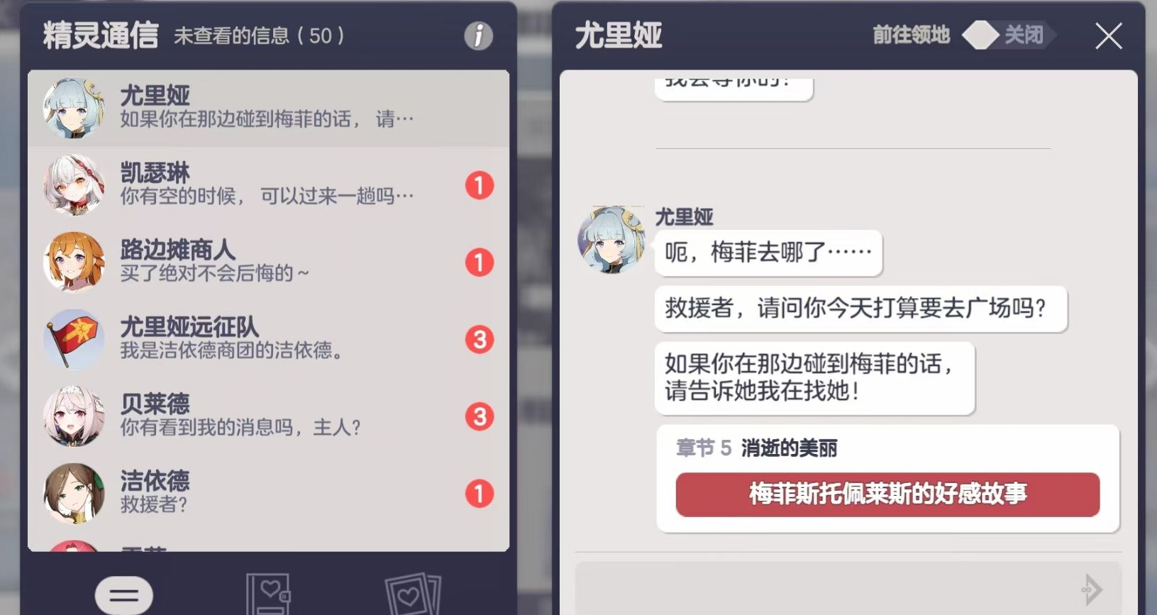 精灵的好感结局只有当玩家将精灵的好感培养至lv9后才能解锁,因此各位可先通过给精灵送礼,提升她对自己的好感等级,等好感达到lv9后,再通过精灵通讯与该精灵聊天,从故事1开始做起,一路做到故事7并完整地体验完所有的剧情,便能看到好感故事的最终结局。每位精灵都有好结局、一般结局和坏结局三类,游戏会根据各位在前期剧情中所作出的选择来决定最终的结局剧情。