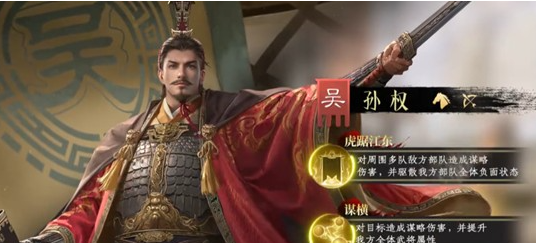 在这套阵容中,核心的武将是孙权,同样也属于续航担当。技能机制会围绕兵力恢复,还有团队增益展开,在战斗的过程中,可以给全队持续回血,稳住血线,还能驱散我方全体负面状态,避免队伍被控制。想让孙权的作用更大点,技能搭配上面有两种思路,如果追求前期的节奏,可以选择激昂类技能,或者是鼓舞类技能。想要强化续航的能力,可以选择愈合技能或者回城技能,在谋略伤害的同时,还可以触发群体回血,让队伍在长时间消耗战中,一直都可以保持保持健康的状态。