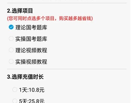 点了账号充值,页面跳到这了。接下来就是你们自由选择的时刻了!自行选择要充值什么课程,理论还是视频?充多少天?