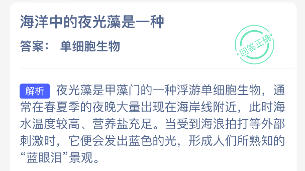 海洋中的夜光藻是一种?【神奇海洋】12月13日新题目已开答!正确答案现已公布,点击领取拼图,一起为修复海洋生态贡献力量!今日正确答案是:【单细胞生物】。夜光藻是甲藻门的一种浮游单细胞生物,通常在春夏季的夜晚大量出现在海岸线附近。