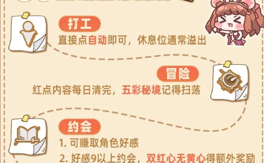 《空灵诗篇》日常必做任务:每日需完成【打工】自动派遣、【冒险】红点扫荡(含五彩秘境)、【约会】提升角色好感并获取奖励、【领地拜访】清扫怪物(可扫荡或互助)、【好友互动】交换爱心与租借角色,以及清空【每日/每周任务】积累贡献。高效完成可稳定获取养成资源与好感道具。