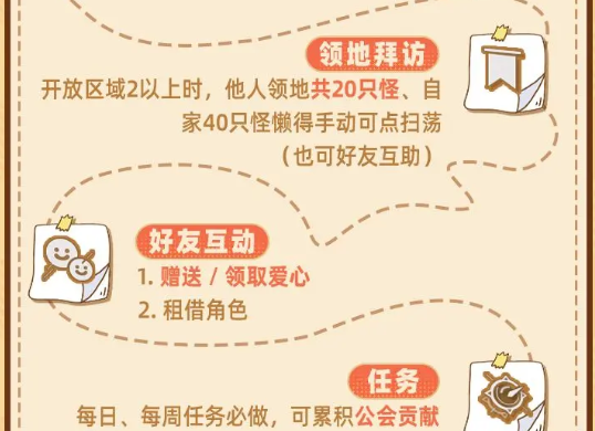 4、领地拜访:开放区域2以上时,他人领地共20只怪、自家40只怪懒得手动可点扫荡(也可好友互助)。