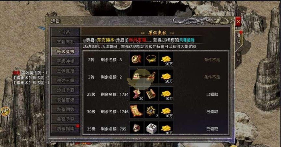 3、新区最快速的提升等级方式:进入游戏后在第一时间先购买个双倍经验卷,等快速达到28级已经可以配合系统送的时限经验勋章,10倍经验卷,快速提升自身等级,这种经验全用了的情况下一般1到1个半小时就可以达到50级然后转生了。