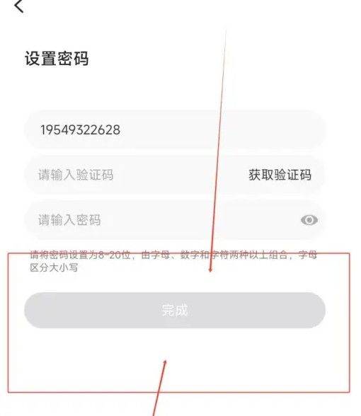 在设置界面中输入验证码和密码后,点击“完成”,即可完成设置登录密码的操作