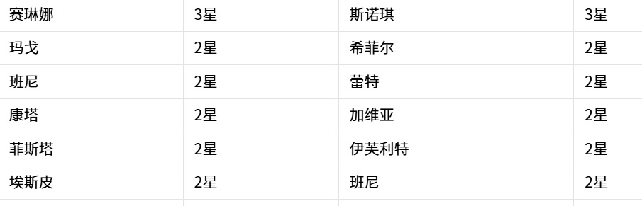 2星以及一星也做出了优化调整,在2星阵营中,西菲尔还有加维亚等实用性的角色会留下来,另外又新增加马约等觉角色,可以满足不同阵容的搭配需求。不管是作用于一开始的过渡,还是后期功能性的补充都是比较合适的。异星使徒方面有贝鲁,刘美美,还有雷吉等新手友好型的角色,确保萌新刚入坑之后就可以迅速的凑齐基础性队伍,能平稳的度过初期开荒阶段。