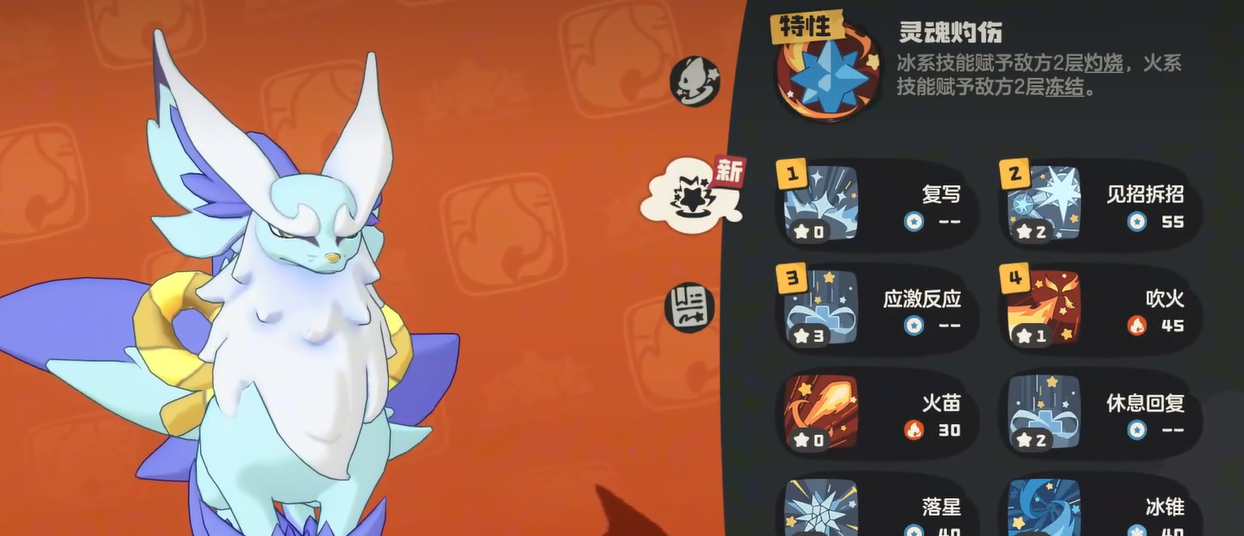 再来看看它的特性,灵魂灼烧这个特性真的挺有意思。用冰系技能打人的时候会给对面叠灼烧效果,用火系技能的时候又能叠冰冻效果,这种交叉叠加的机制让尖嘴狐仙的持续输出能力变得很强。敌人身上的负面状态越多,受到的伤害自然也就越高,打起来会越来越轻松。